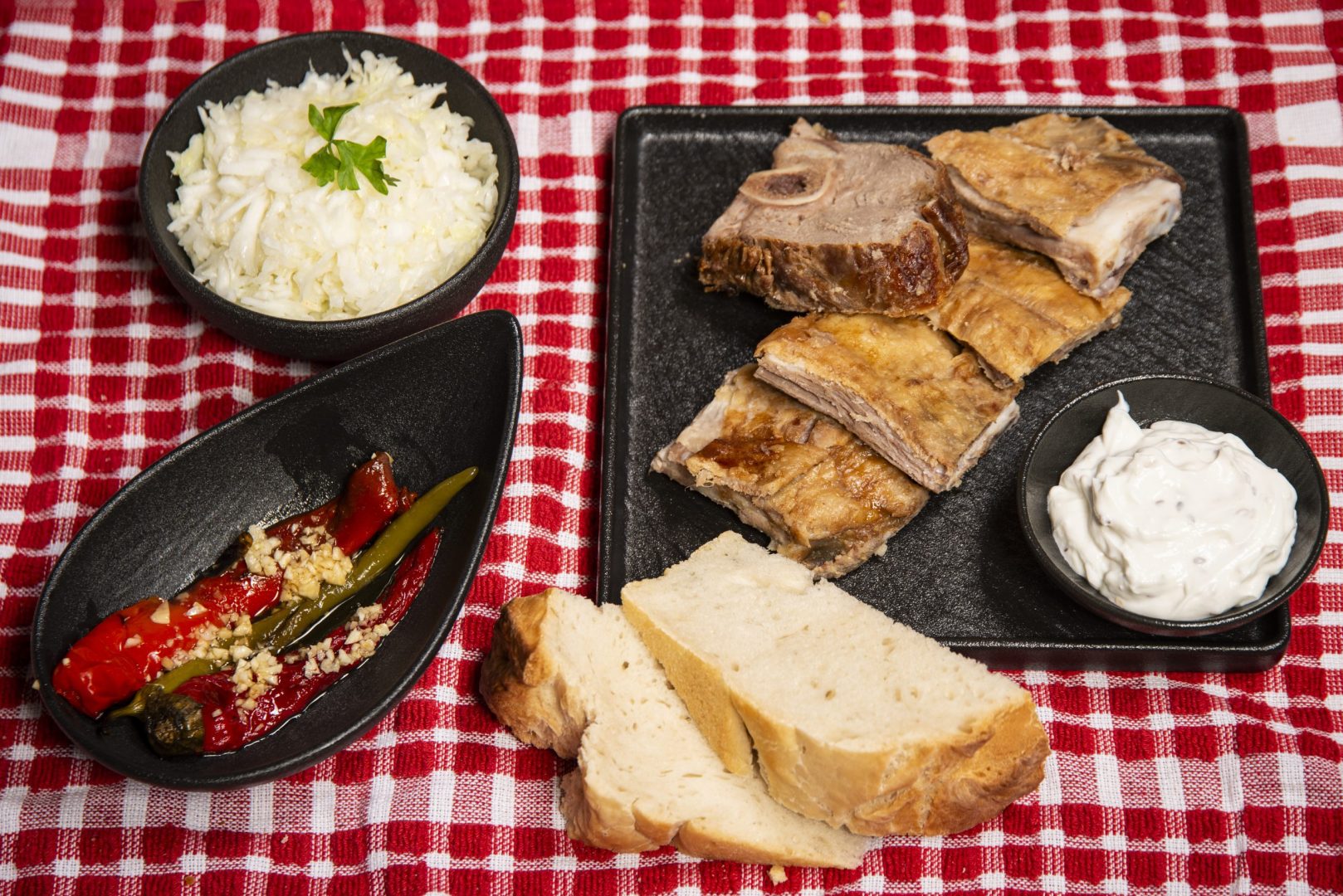 Served with fresh cabbage salad, sesame cheese, garlic peppers, and homemade bread – a true